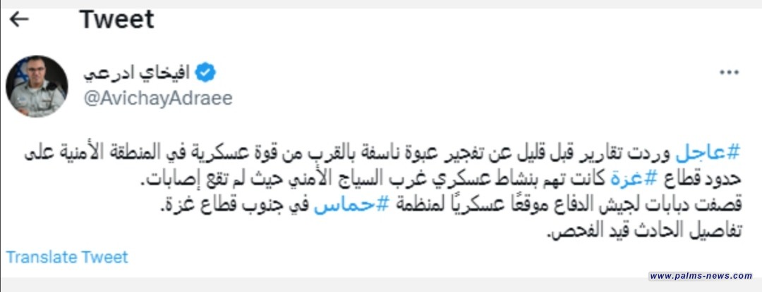 كما أضاف المتحدث أنه جرى تفجير عبوة ناسفة بالقرب من قوة عسكرية في المنطقة الأمنية على حدود قطاع غزة، مشيرا إلى عدم وقوع إصابات.