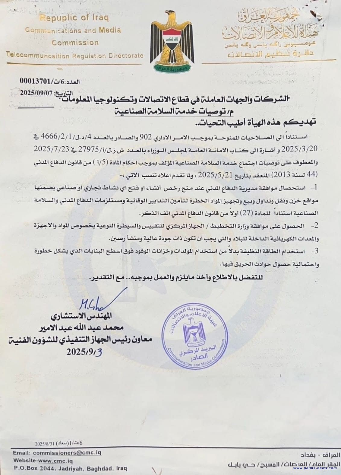 الإعلام والاتصالات تصدر توجيهات ملزمة لتعزيز متطلبات السلامة الصناعية في قطاع الاتصالات وتكنولوجيا المعلومات.