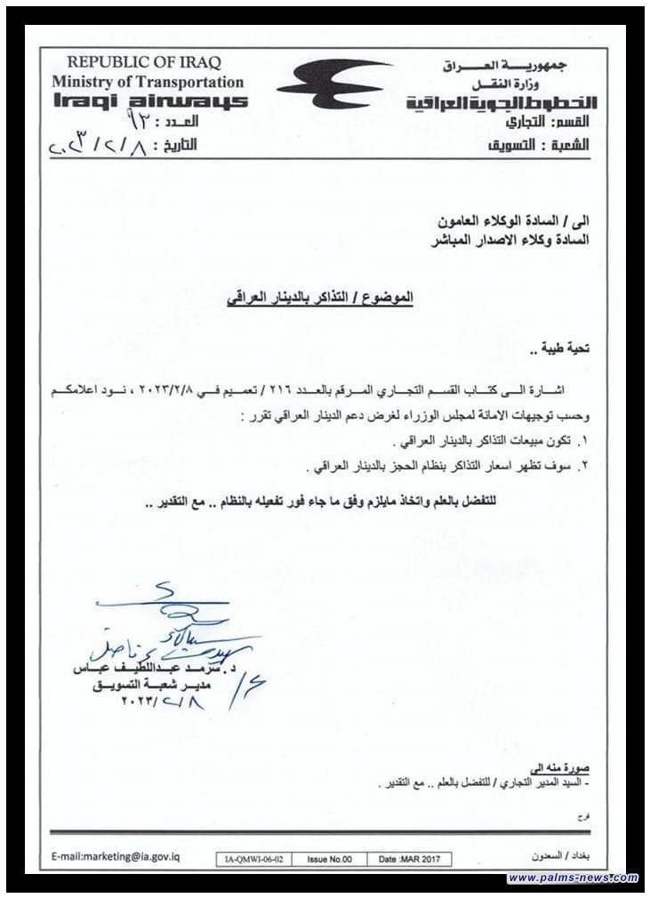 بالوثيقة الخطوط الجوية العراقية تلزم اصحاب المكاتب والشركات ببيع تذاكر الخطوط الجوية العراقية بالدينار العراقي