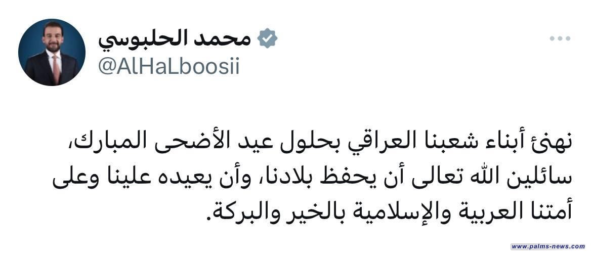 قدم رئيس مجلس النواب محمد الحلبوسي, التهاني بمناسبة عيد الأضحى المبارك.