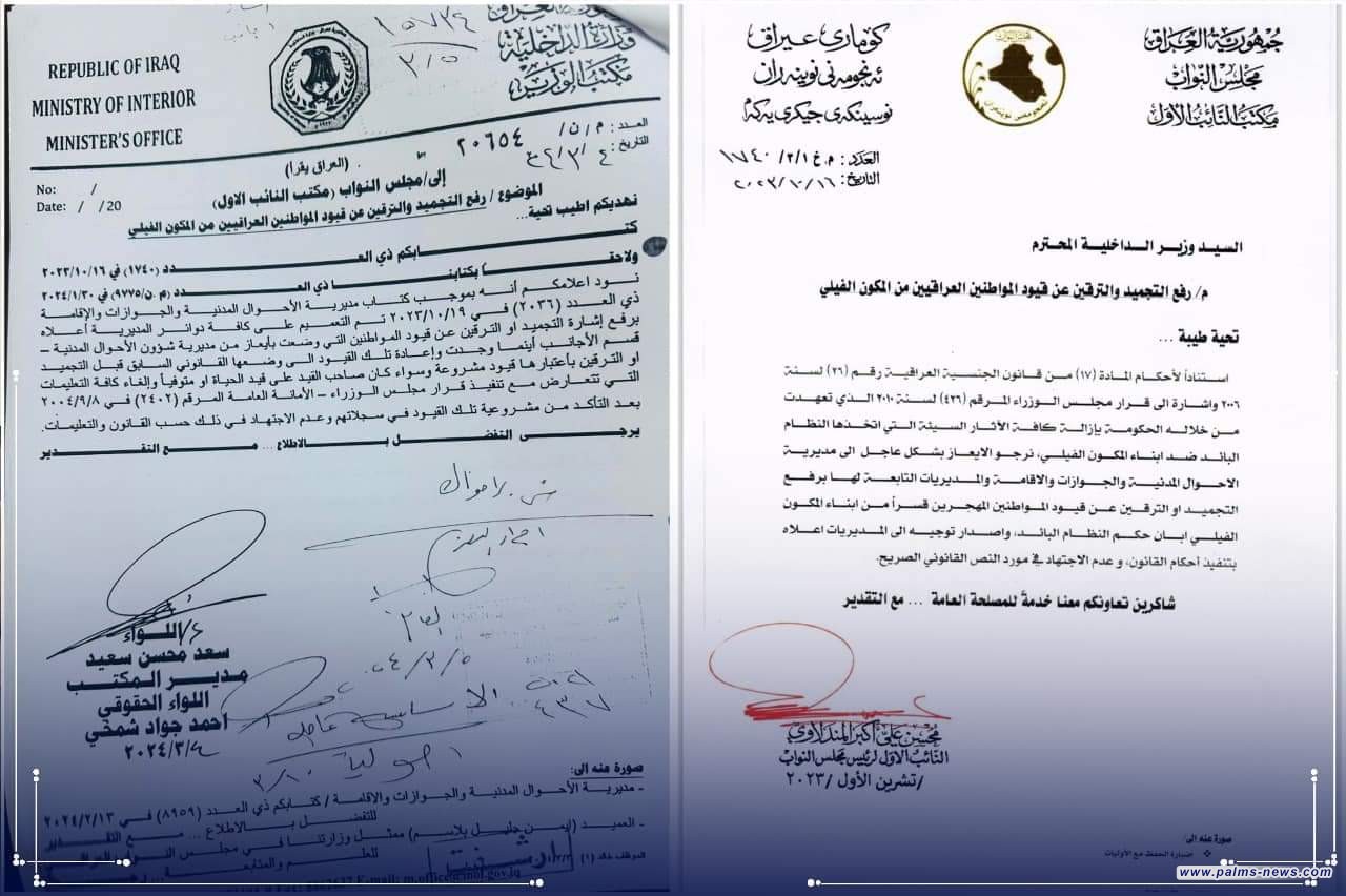 وجه مكتب وزير الداخلية عبد الأمير الشمري، بالتعميم على كافة دوائر مديرية الأحوال المدنية والجوازات والإقامة، برفع إشارة التجميد أو الترقين عن قيود المواطنين العراقيين من المكون الفيلي، والتي وضعت بإيعاز من مديرية شؤون الاحوال المدنية – قسم الأجانب.