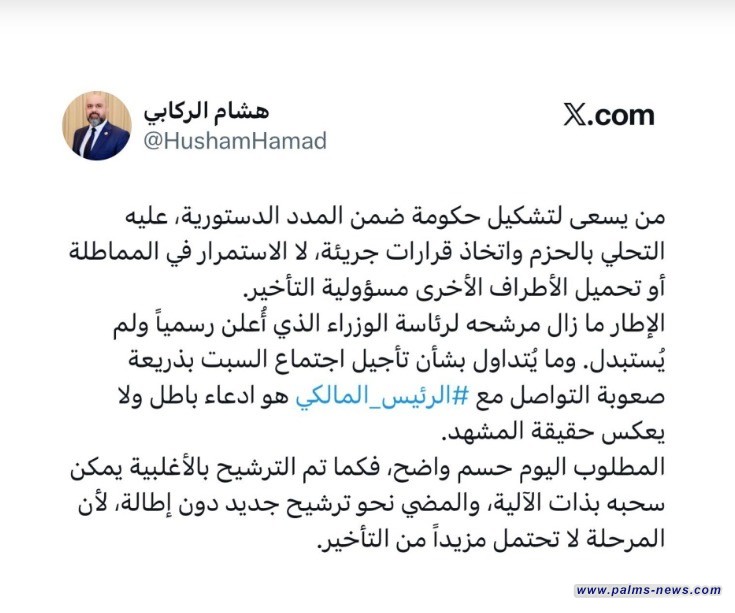 وقال الركابي بتغريدة على حسابه في منصة "أكس"، إنه "من يسعى لتشكيل حكومة ضمن المدد الدستورية، عليه التحلي بالحزم واتخاذ قرارات جريئة لا الاستمرار في المماطلة أو تحميل الأطراف الأخرى مسؤولية التأخير".