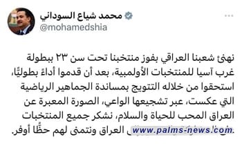 وجاء هذا  في تغريدة للسوداني، قائلا : “نهنئ شعبنا العراقي بفوز منتخبنا تحت سن ٢٣ ببطولة غرب آسيا للمنتخبات الأولمبية، بعد أن قدموا أداءً بطوليًّا، استحقوا من خلاله التتويج بمساندة الجماهير الرياضية التي عكست، عبر تشجيعها الواعي، الصورة المعبرة عن العراق المحب للحياة والسلام”.
