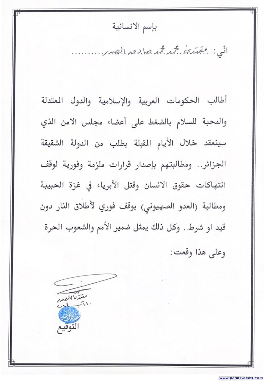 وقال الصدر في وثيقة مذيلة بتوقيعه: "أطالب الحكومات العربية والإسلامية والدول المعتدلة والمحبة للسلام، بالضغط على أعضاء مجلس الامن الذي سينعقد خلال الأيام المقبلة بطلب من الدولة الشقيقة الجزائر ومطالبتهم بإصدار قرارات ملزمة وفورية لوقف انتهاكات حقوق الانسان وقتل الأبرياء في غزة الحبيبة، ومطالبة (العدو الصهيوني) بوقف فوري لأطلاق النار دون قيد او شرط". وأضاف، انه "كل ذلك يمثل ضمير الأمم والشعوب الحرة"