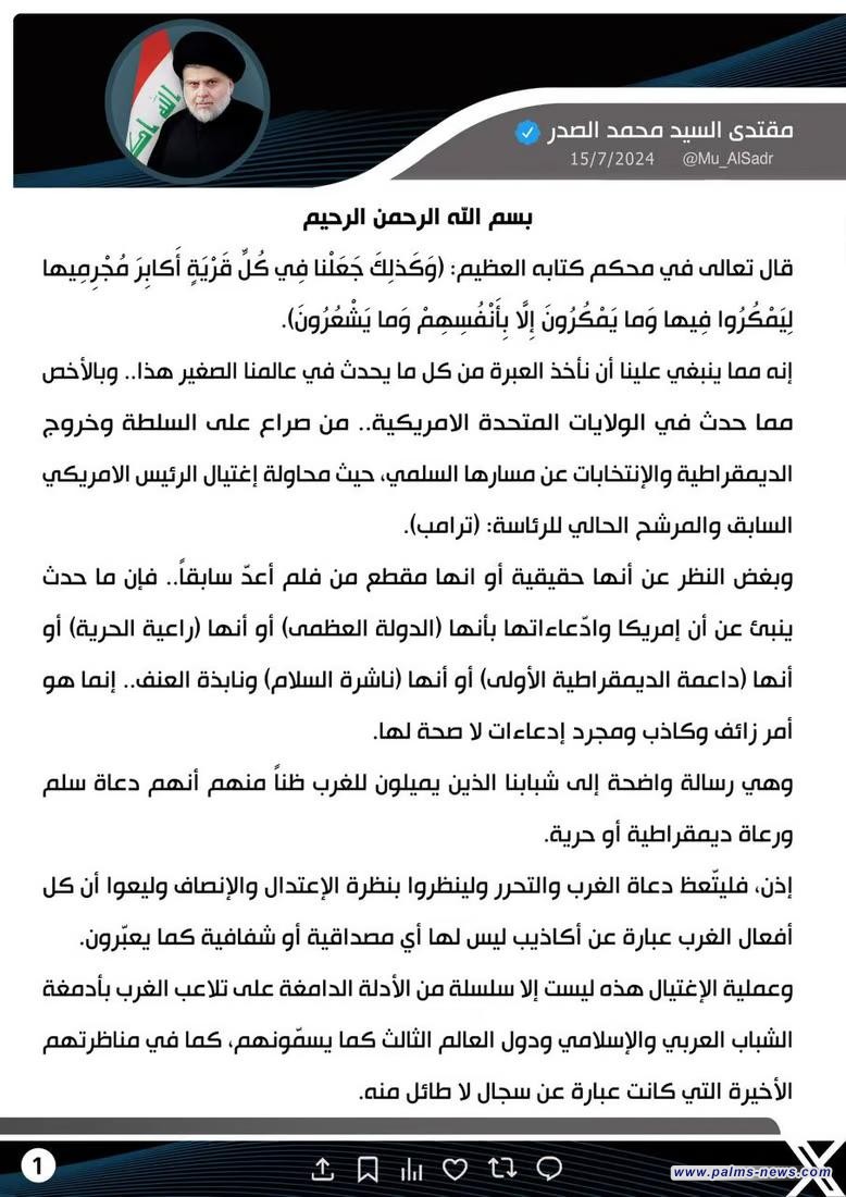 قال زعيم التيار الشيعي الوطني العراقي مقتدى الصدر، اليوم الاثنين الخامس عشر من تموز، في تدوينة له عبر منصة (x) إن محاولة اغتيال الرئيس الأمريكي دونالد ترامب، بمثابة رصاصة الرحمة في جسد أمن الولايات المتحدة وديمقراطيتها وحريتها.