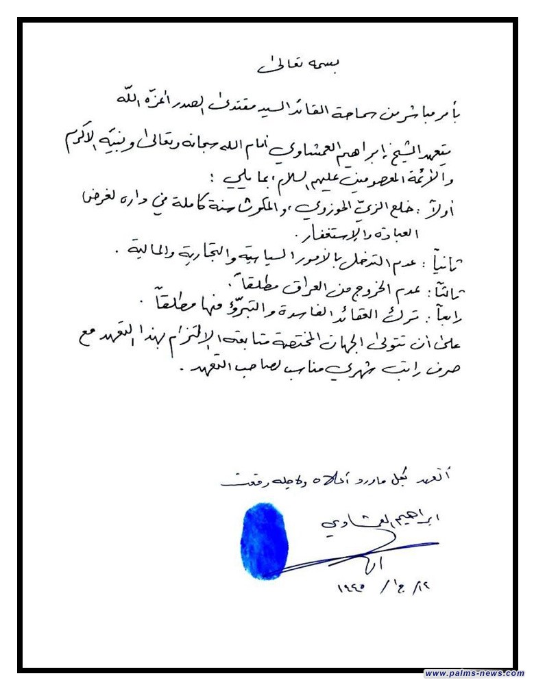 وقال المكتب أنه "بأمر مباشر من القائد مقتدى الصدر بتعهد الشيخ إبراهيم العمشاوي أمام الله بخلع الزيّ الحوزوي والمكوث سنة للعبادة والاستغفار وعدم التدخل بالأمور السياسية والتجارية والمالية، فيما تعهد العمشاويبعدم الخروج من العراق مطلقاً وترك العقائد الفاسدة والتبرّؤ منها مطلقاً".