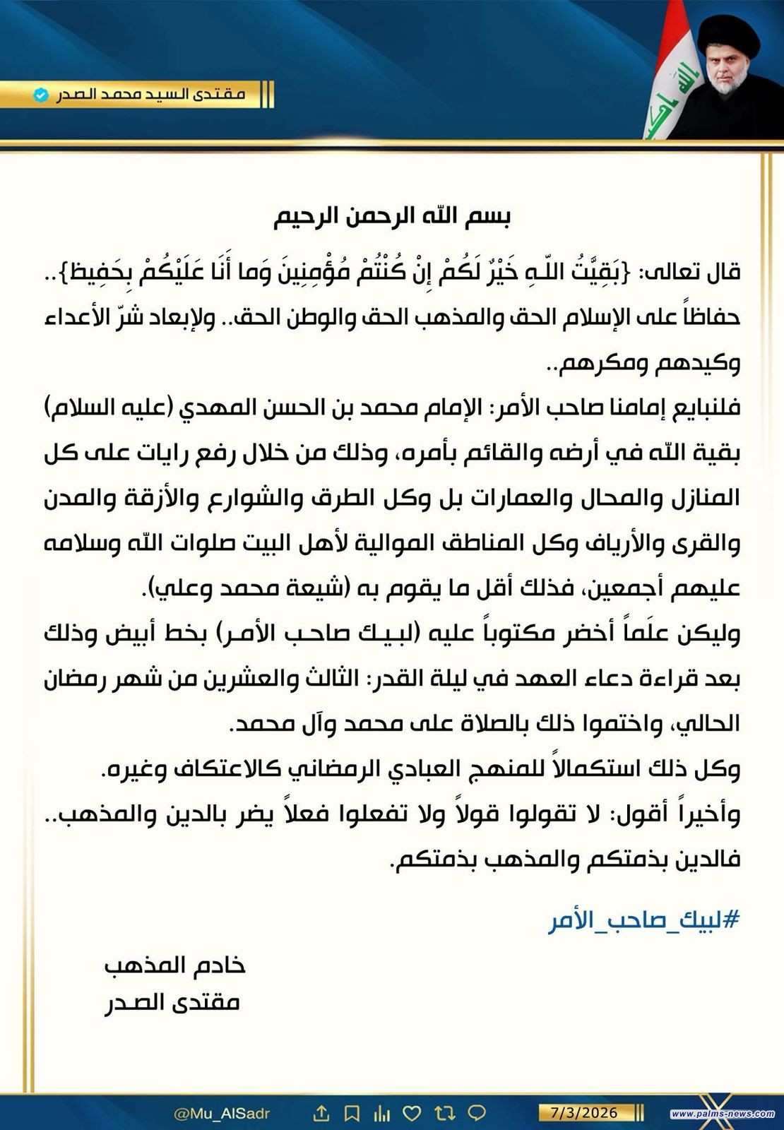 الصدر يدعو العراقيين لرفع "الرايات الخضر" نصرة للدين والمذهب