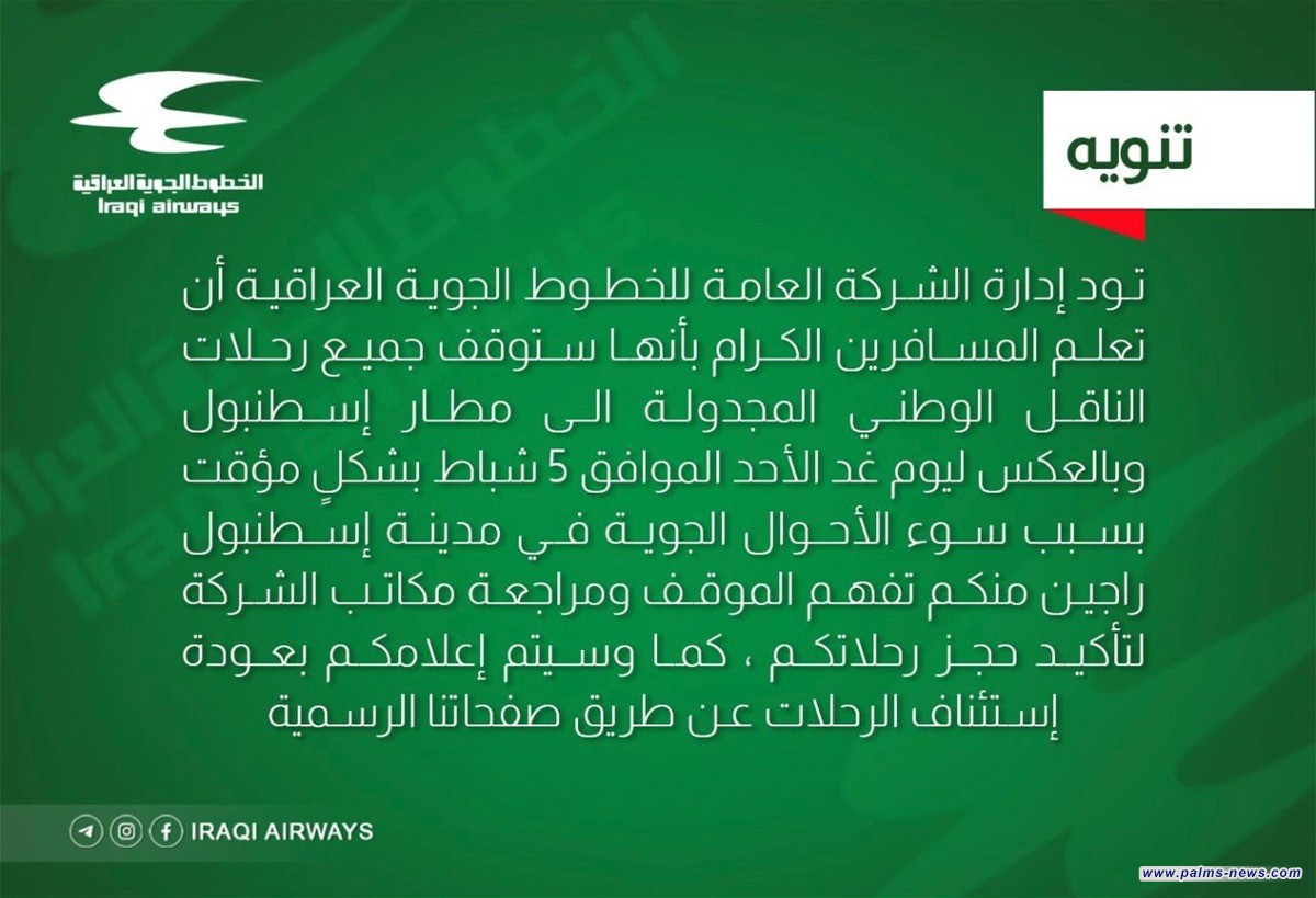 وقالت الادارة في بيان : إنها "تود ان تعلم المسافرين الكرام بأنها ستوقف جميع رحلات الناقل الوطني المجدولة الى مطار اسطنبول وبالعكس ليوم الغد الاحد الموافق 5 شباط بشكل مؤقت بسبب سوء الاحوال الجوية في مدينة اسطنبول". واضافت :"راجين منكم تفهم الموقف ومراجعة مكاتب الشركة لتأكيد حجز رحلاتكم"، مشيرة الى انه "سيتم إعلامكم بعودة إستئناف الرحلات عن طريق صفحاتنا الرسمية".