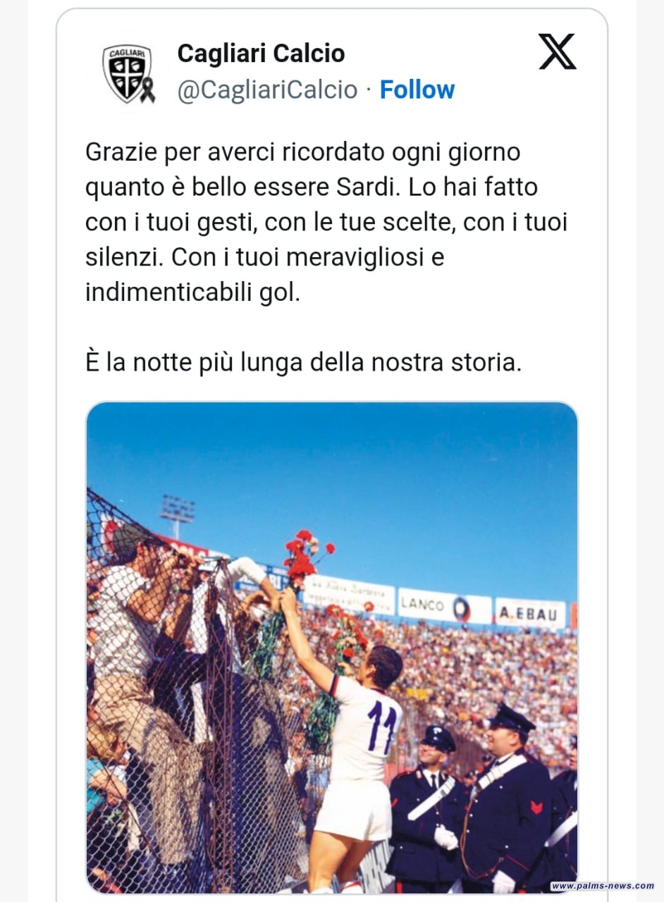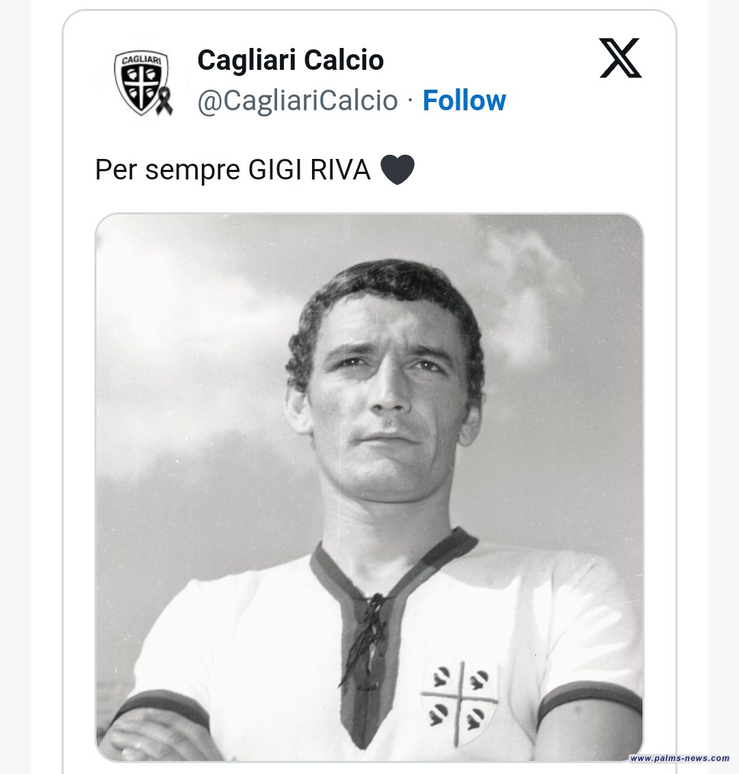 كما نعى نادي كالياري هدافه التاريخي، الذي لعب نحو (13) سنة في صفوفه، إذ لعب ريفا معظم مسيرته الكروية مع نادي كالياري، وكان هداف الدوري الإيطالي عندما فاز الفريق، الواقع مقره في سردينيا، بلقب الدوري الإيطالي للمرة الوحيدة في تاريخه عام 1970. وكان جيجي ريفا الرئيس الشرفي للنادي حتى وفاته.