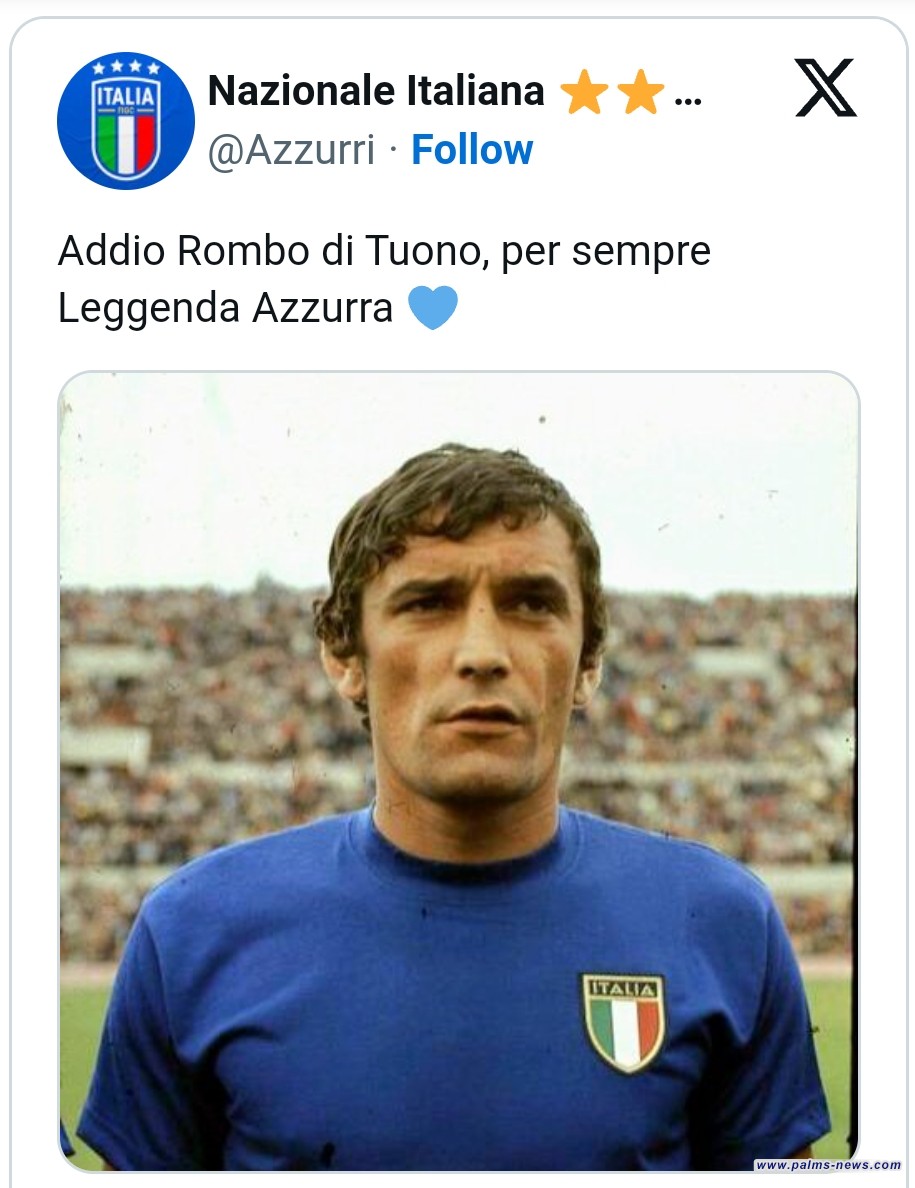 أعلن الاتحاد الإيطالي لكرة القدم، في بيان له، اليوم الثلاثاء الثالث والعشرين من يناير وفاة الهداف التاريخي للمنتخب الإيطالي لويجي ريفا، عن عمر ناهز (79) عاماً، بعد معاناة مع المرض.