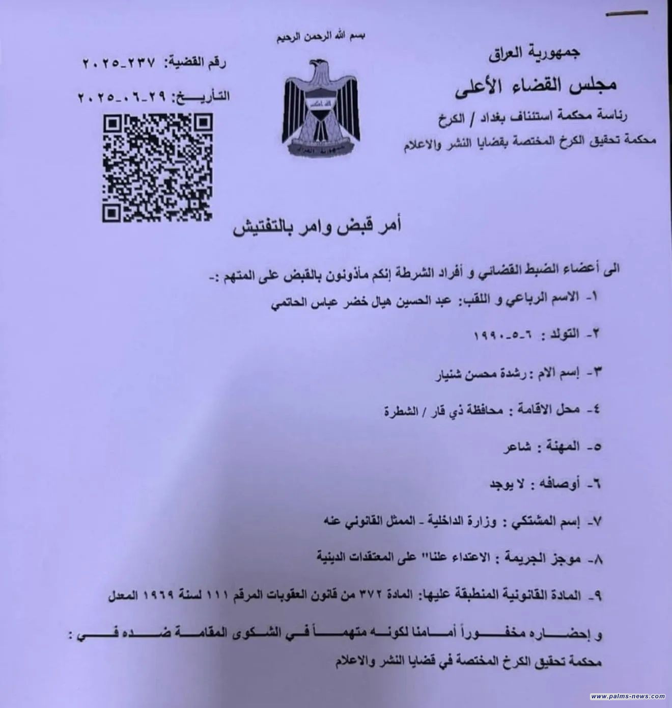 بالوثيقة : صدور أوامر قبض بحق الشاعر عبد الحسين هيال.
