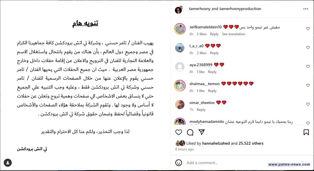 وجاء في بيان تامر الذي أصدره قبل ساعات من إحيائه حفل "عيد الحب" في "فاميلي بارك": "يهيب الفنان تامر حسني، وشركة "تي إتش برودكشن" بجميع جماهيرنا الكرام في مصر وكل دول العالم، بأن هناك من ينتحل ويستغل الاسم والعلامة التجارية للفنان في الترويج والإعلان عن إقامة حفلات داخل وخارج جمهورية مصر العربية، حيث إن كل الحفلات التي يحييها الفنان تامر حسني يعلن عنها من خلال صفحاته الرسمية وشركة "تي إتش برودكشن" فقط".