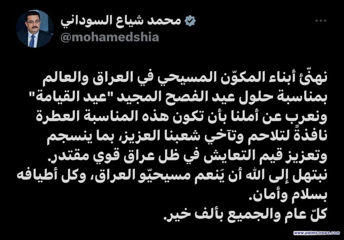 نخيل نيوز / العراق هنأ رئيس الوزراء محمد شياع السوداني، اليوم الاحد، المكوّن المسيحي بمناسبة حلول عيد الفصح المجيد "عيد القيامة".