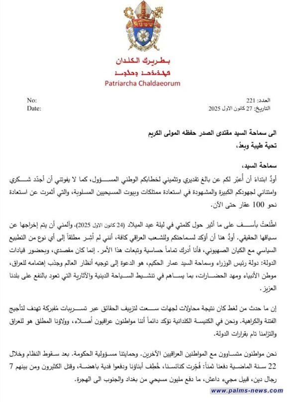 أرسل غبطة البطريرك الكاردينال لويس روفائيل ساكو، اليوم السبت، رسالة الى زعيم التيار الوطني الشيعي، مقتدى الصدر فيما يلي نصها: