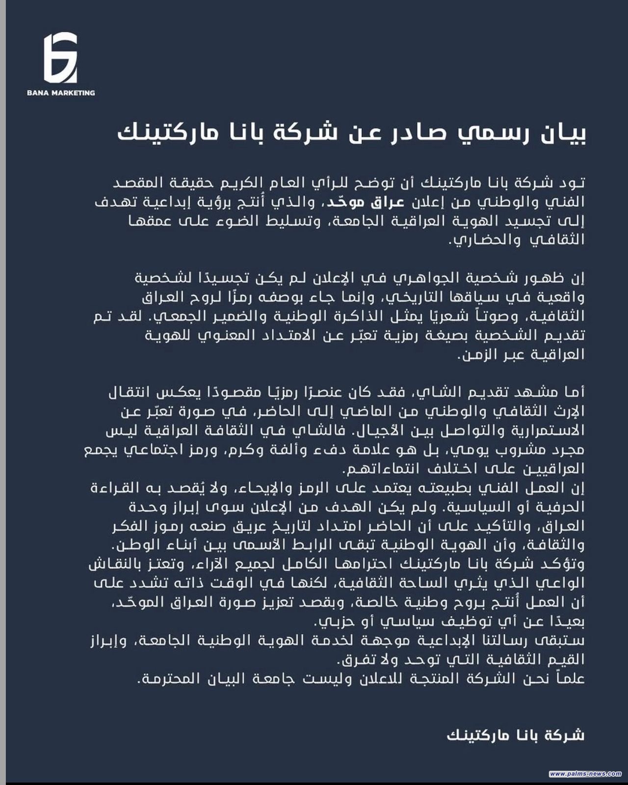 شركة بانا ماركتينك تصدر بيانًا توضيحيًا بشأن إعلان"عراق موحّد"