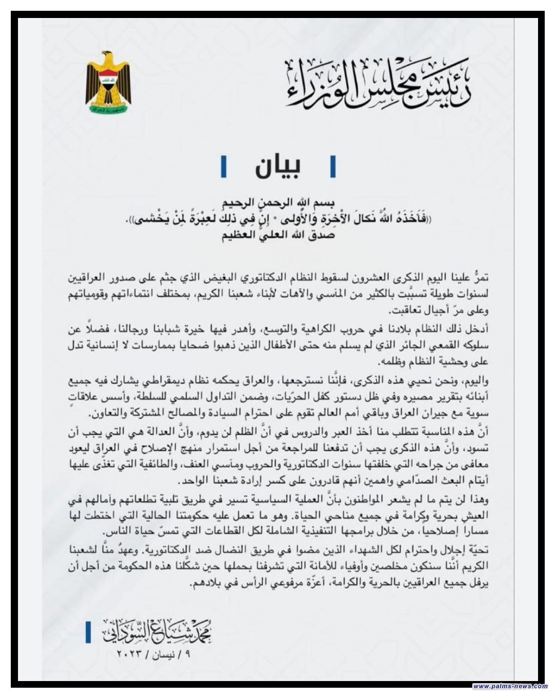 وجاء في البيان : “تمرُّ علينا اليوم الذكرى العشرون لسقوط النظام الدكتاتوري البغيض الذي جثم على صدور العراقيين لسنوات طويلة تسبَّبت بالكثير من المآسي والآهات لأبناء شعبنا الكريم، بمختلف انتماءاتهم وقومياتهم وعلى مرّ أجيال تعاقبت”.