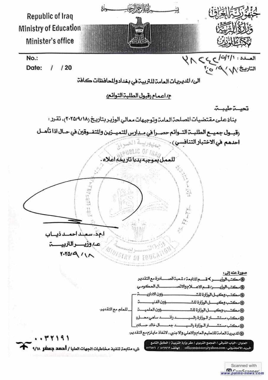 وذكرت الوزارة في بيانها، ان الوزير وجه بقبول جميع الطلبة التوائم (حصرا) في مدارس المتميزين والمتفوقين في حال تأهل أحدهم في الاختبار التنافسي.
