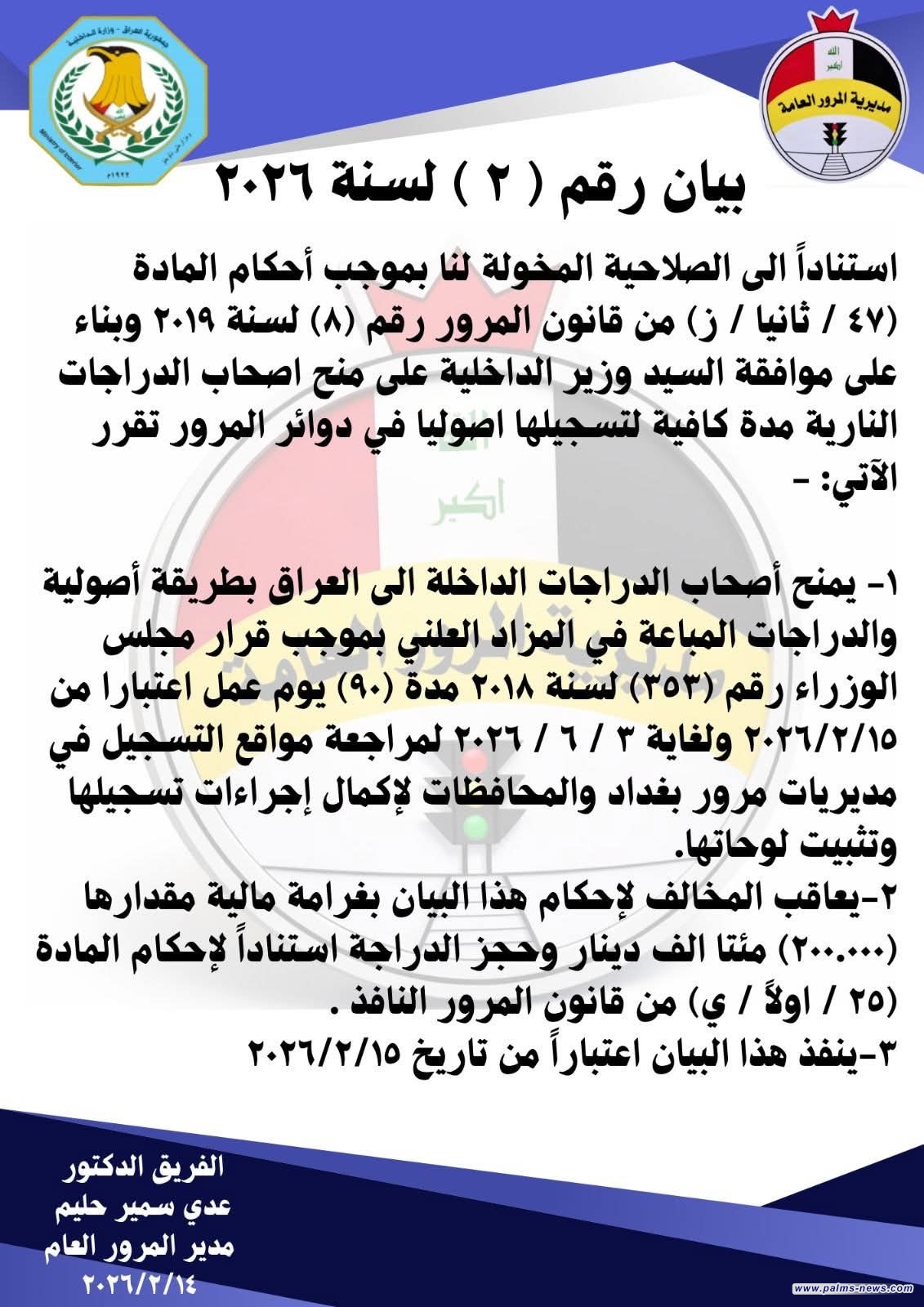 وقالت المديرية في بيان تابعته وكالة نخيل عراقي انه "استناداً الى الصلاحية المخولة لنا وبناء على موافقة وزير الداخلية على منح أصحاب الدراجات النارية مدة كافية لتسجيلها اصوليا في دوائر المرور تقرر ما يلي: