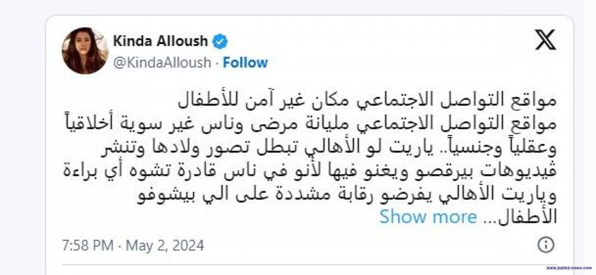 نشرت الفنانة كندة علوش، على حسابها الرسمي على موقع التواصل الاجتماعي "X"، رسالة قوية وجهتها لأولياء أمور الأطفال الذي تأخذ مواقع السوشيال ميديا أغلب أوقاتهم، من دون أي تدخل من آبائهم.