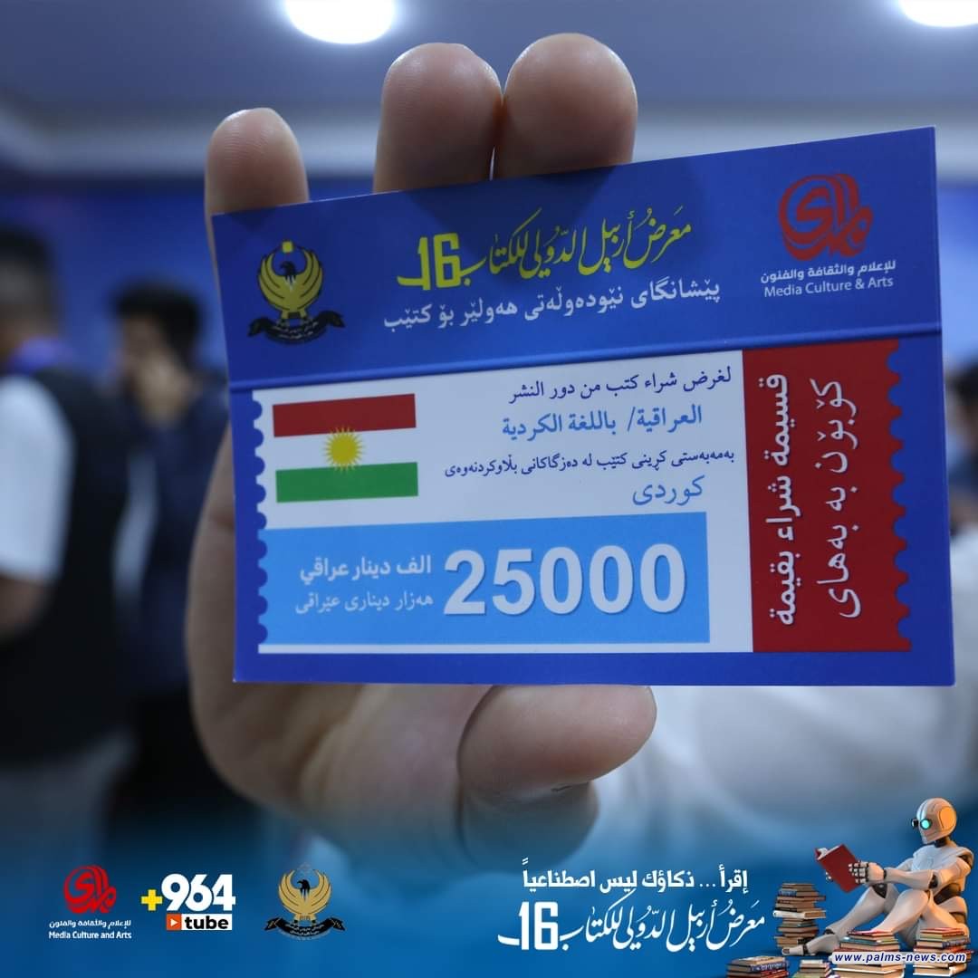 ضمن فعاليات معرض أربيل الدولي للكتاب، بدورته 16، أعلنت مؤسسة المدى للثقافة والفنون الراعي الرسمي والمنظم للمعرض، اليوم الاثنين الثاني والعشرين من نيسان، توزيع كوبونات بقيمة (25) ألف دينار، مجاناً على زوار المعرض، تشجيعاً على القراءة ودعم ذوي الدخل المحدود.