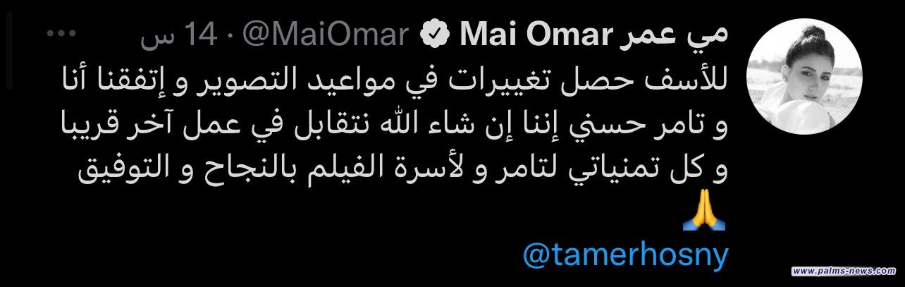 وكتبت مي عمر عبر صفحتها في " تويتر " تابعته " نخيل نيوز " : للأسف حصل تغييرات في مواعيد التصوير واتفقنا أنا وتامر حسني إنّنا إن شاء الله نتقابل في عمل آخر قريبًا وكل تمنياتي لتامر ولأسرة الفيلم بالنجاح والتوفيق .