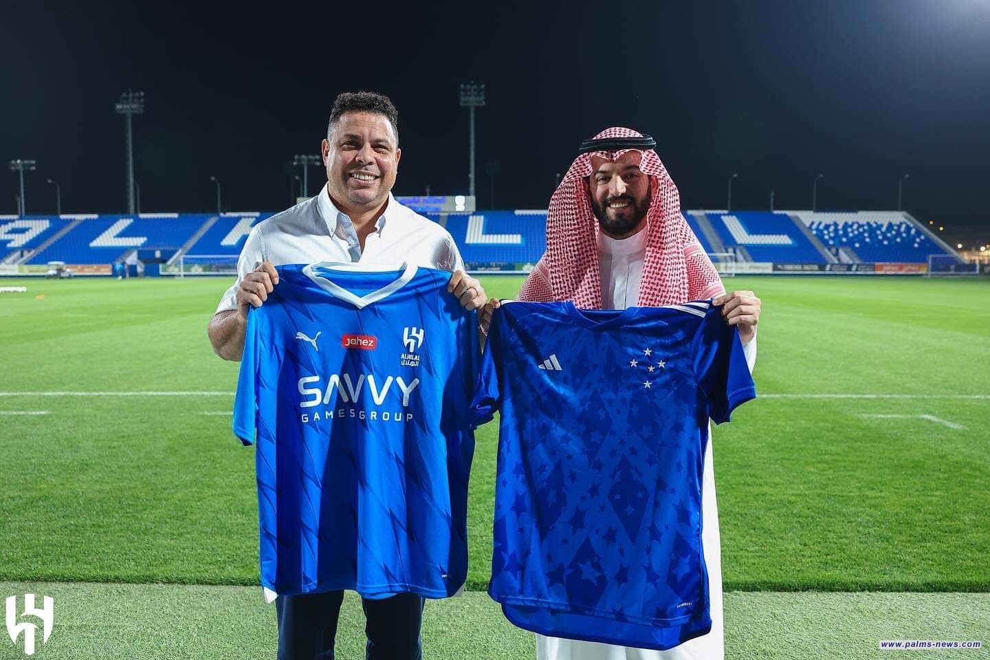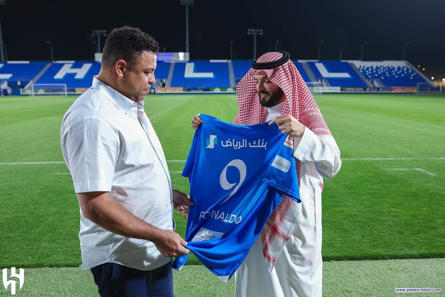 ضمن تواجده في السعودية، أهدى مسؤولو نادي الهلال السعودي قميص الفريق إلى الظاهرة البرازيلية رونالدو، حمل الرقم (9) واسمه، خلال زيارته لمقر النادي أمس السبت.