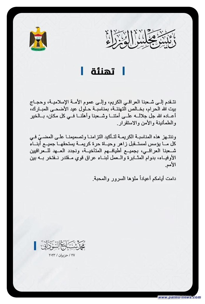 السوداني مهنئاً بعيد الأضحى: نجدد العهد بالعمل لبناء عراق قوي مقتدر