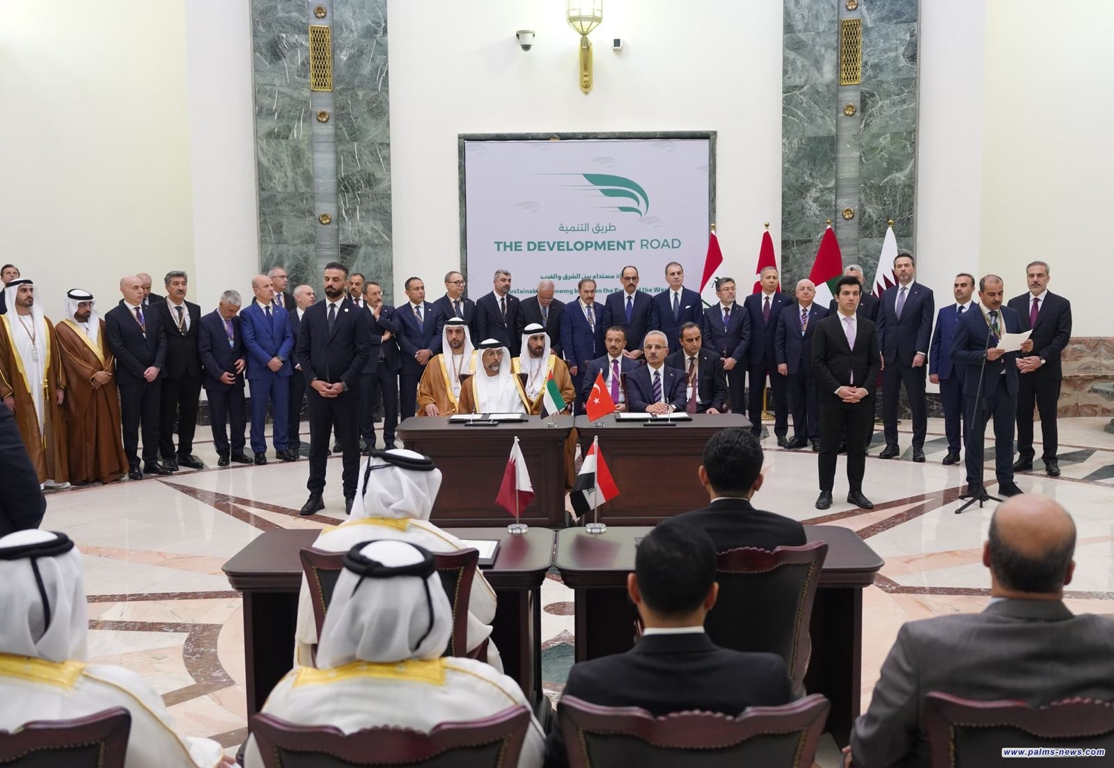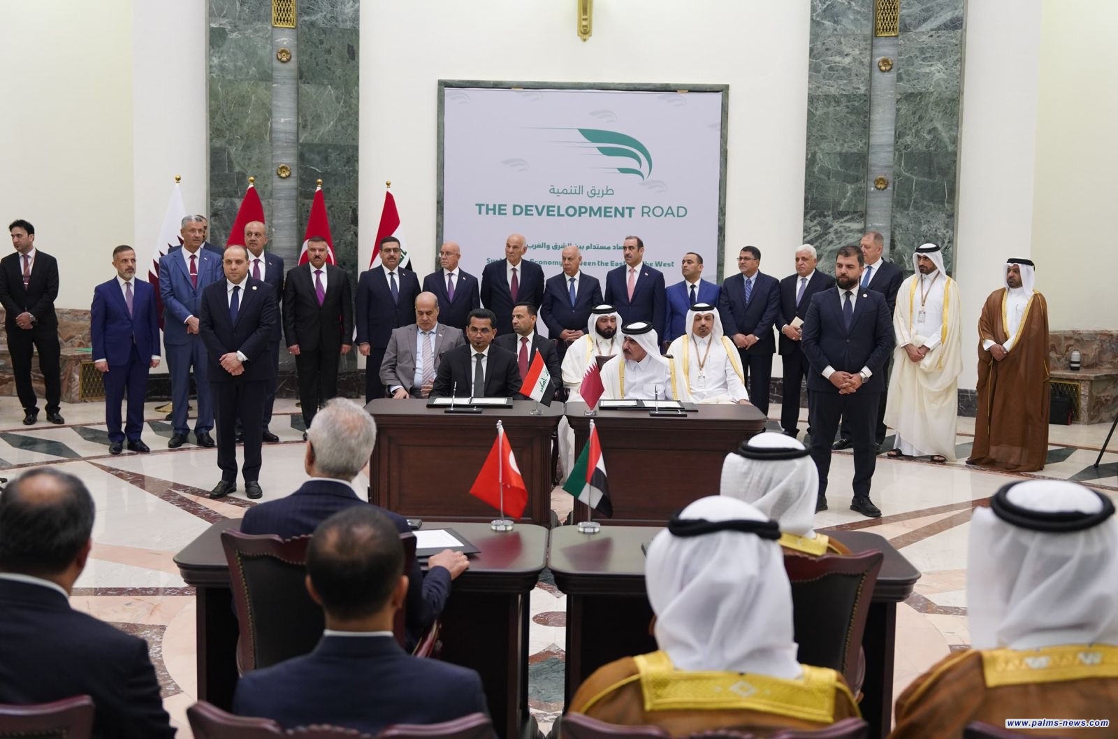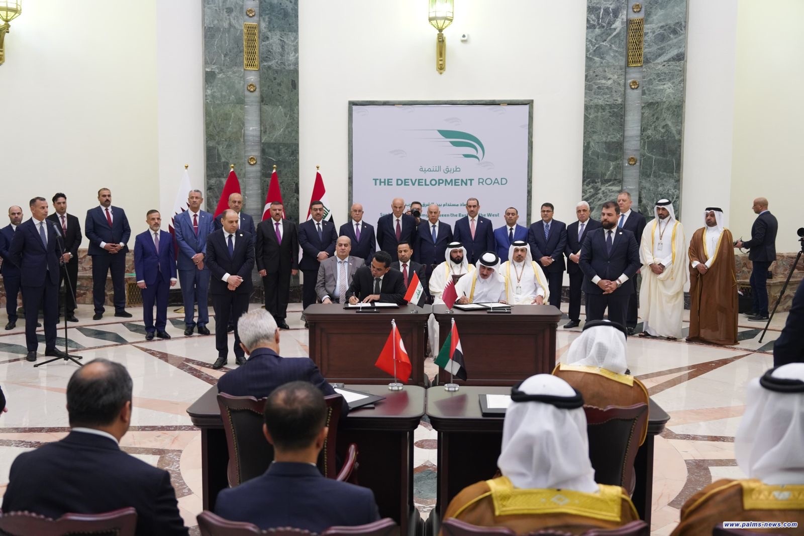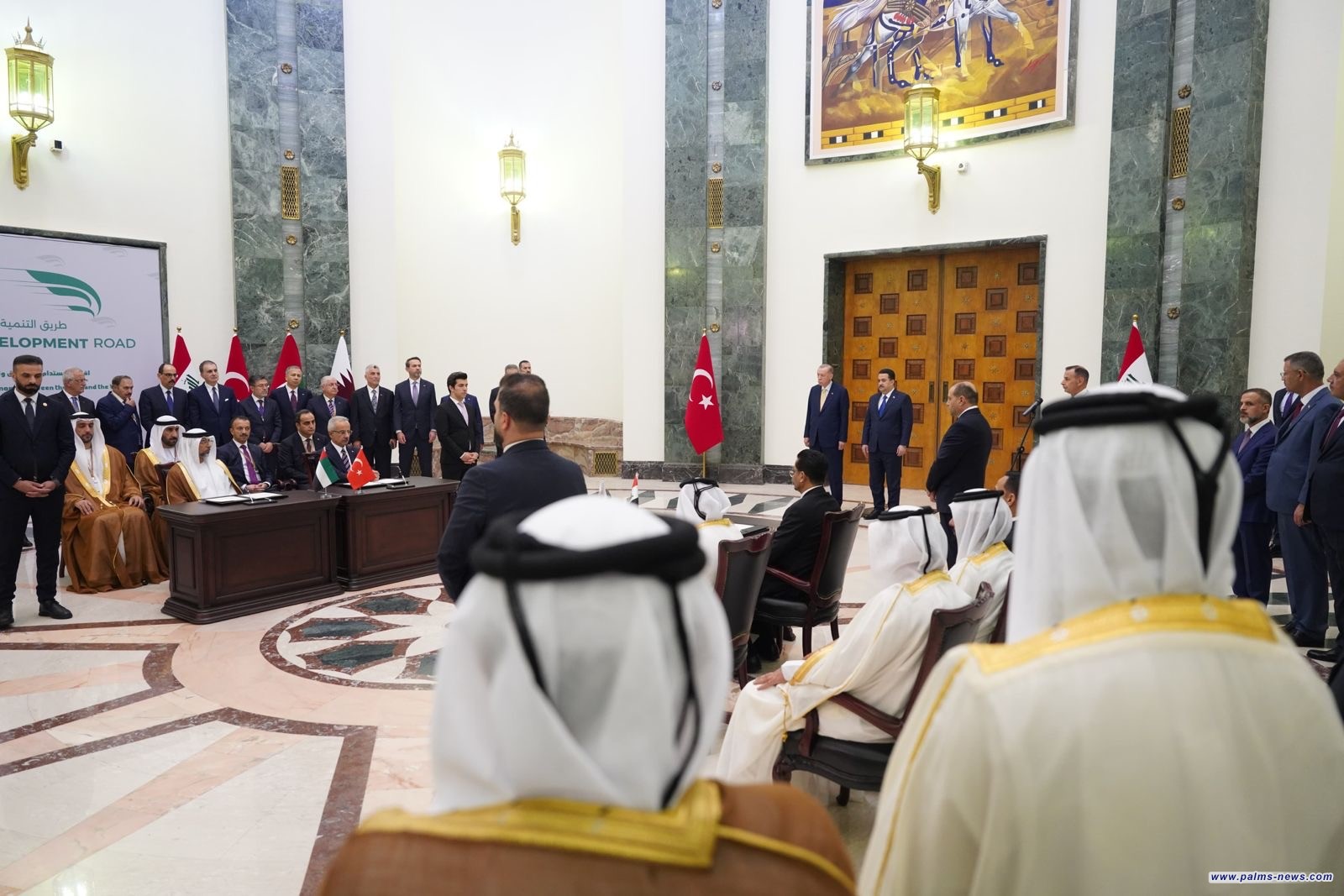 رعى رئيس مجلس الوزراء السيد محمد شياع السوداني، والرئيس التركي السيد رجب طيب أردوغان، في بغداد اليوم الاثنين، مراسم توقيع مذكرة تفاهم رباعية بين العراق وتركيا وقطر والامارات، تهدف الى التعاون المشترك بشأن (مشروع طريق التنمية) الستراتيجي، وذلك بحضور أعضاء الوفدين التركي والعراقي، من وزراء ومستشارين.