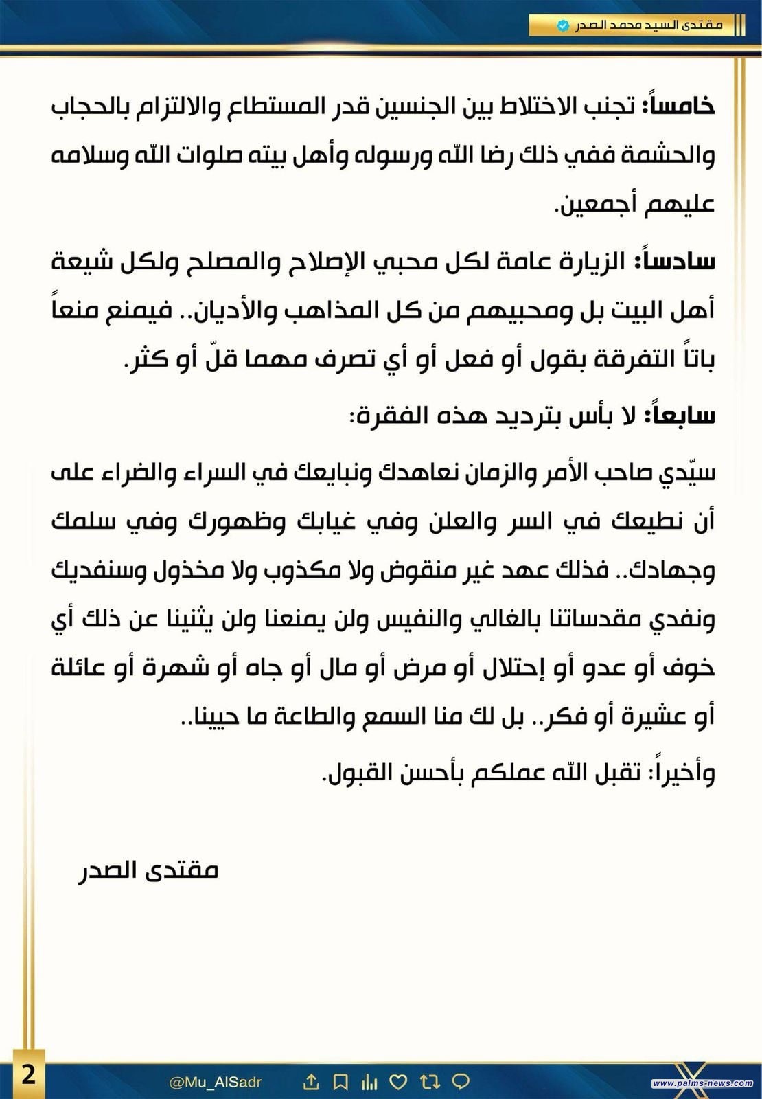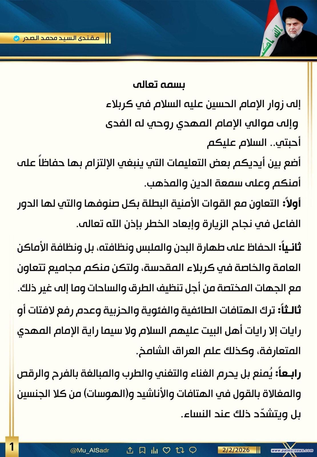 وقال السيد الصدر في بيان ورد لـ السومرية نيوز، "إلى زوار الإمام الحسين عليه السلام في كربلاء وإلى موالي الإمام المهدي روحي له الفدى.. أحبتي.. السلام عليكم: