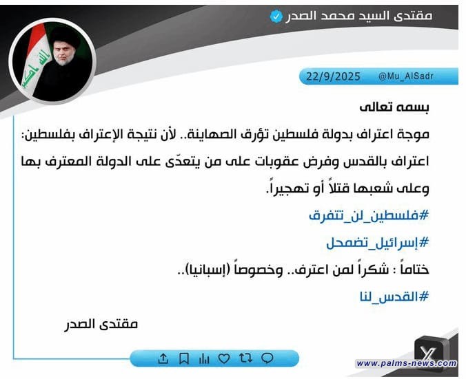 وقال السيد الصدر في تغريدة تابعتها وكالة نخيل عراقي ، ان "موجعة اعتراف بدولة فلسطين تؤرق الصهاينة لان نتيجة الاعتراف بفلسطين اعتراف بالقدس وفرض عقوبات على من يعتدي على الدولة المعترف بها وشعبها قتلا وتهجيرا".
