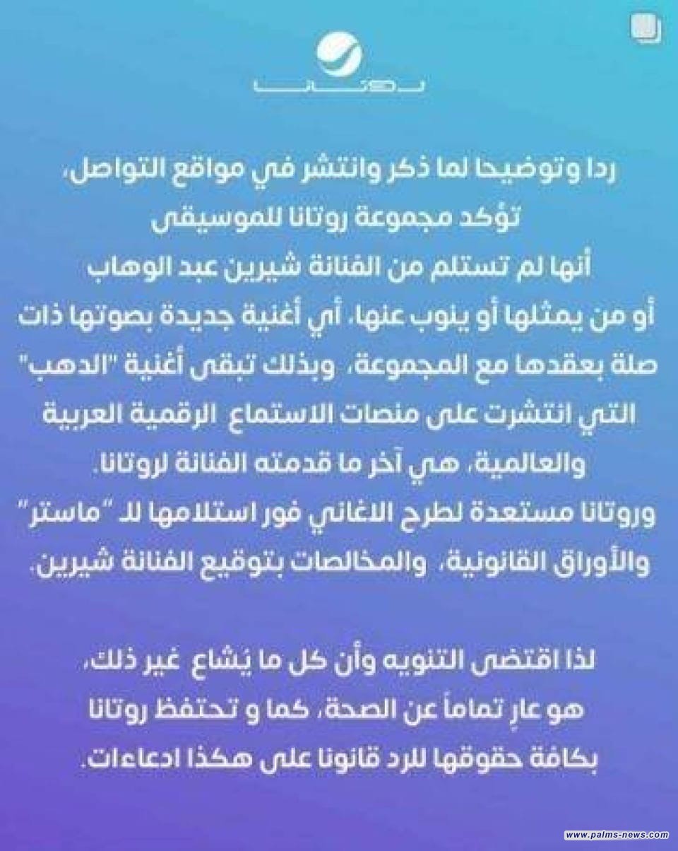 وأضاف البيان: "وبذلك تبقى أغنية "الذهب" والتي نُشرت على منصات الاستماع الرقمية العربية والعالمية، هي آخر ما قدمته الفنانة لـ"روتانا"، و"روتانا" مستعدة لطرح الأغاني فور استلامها للماستر والأوراق القانونية والمخالصات بتوقيع الفنانة شيرين، لذا اقتضى التنويه، وأن كل ما يشاع غير ذلك، هو عار تماماً عن الصحة، كما تحتفظ "روتانا" بكل حقوقها للرد قانوناً على هذه الادعاءات".