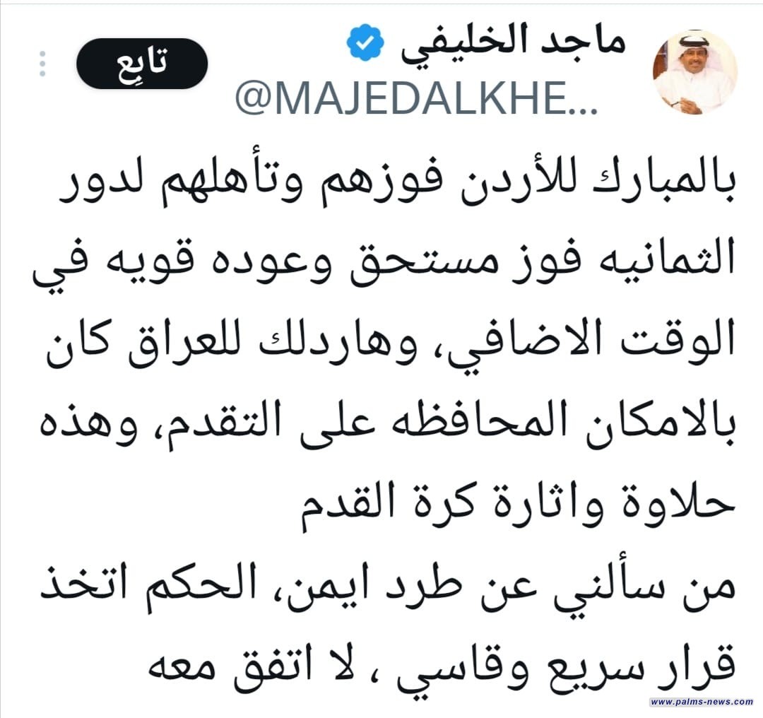 ماجد الخليفي محلل برنامج المجلس: الحكم أخطأ مرتين مرة في الإنذار الأول كان هناك خطأ لأيمن لم يحتسبه والثاني كان طبيعياً كردة فعل لحركة لاعبي الاردن والقرار قاسي جدّاً جدّاً