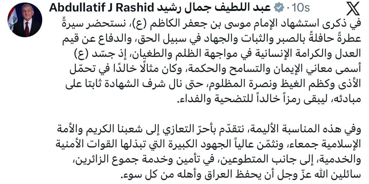 رئيس الجمهورية يعزّي بذكرى استشهاد الإمام موسى بن جعفر الكاظم (ع)
