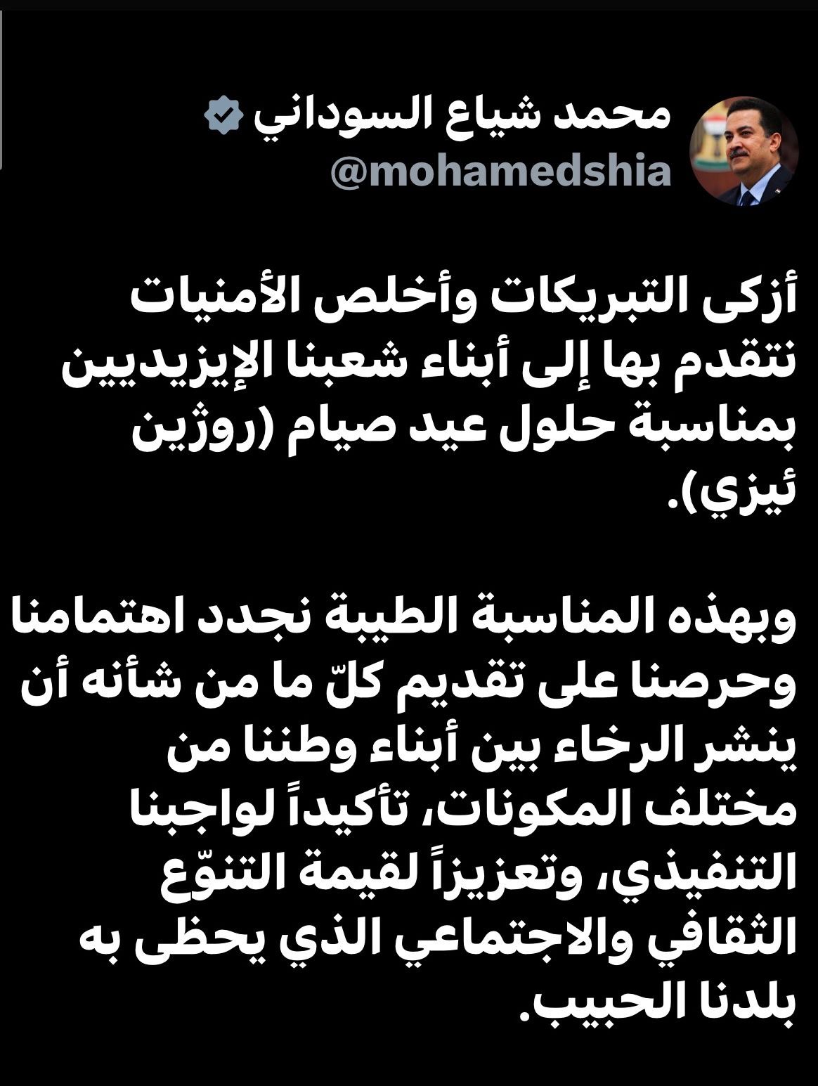 السوداني مهنئا الإيزيديين: نجدد حرصنا على تقديم كلّ ما ينشر الرخاء بين أبناء وطننا