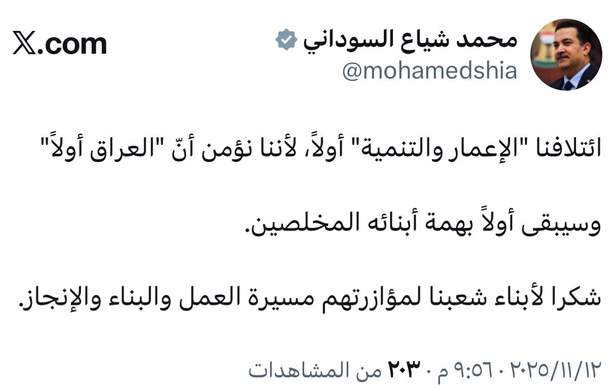 السوداني يشكر العراقيين بعد فوز قائمته في أغلب المحافظات..