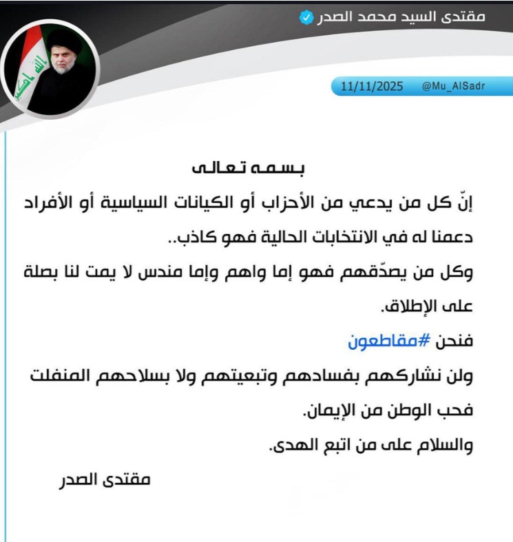 الصدر في يوم الاقتراع يؤكد عدم دعمه لاي مرشح او كتلة سياسية