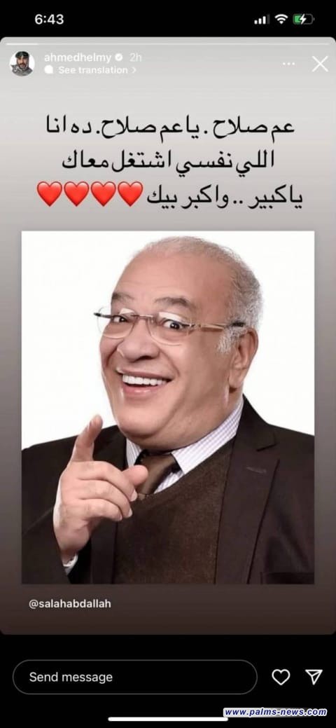 نشر الفنان أحمد حلمي على خاصية القصص المصورة الملحقة على حسابه الخاص بـ"إنستغرام" صورة للفنان صلاح عبد الله رد من خلالها على تصريح الأخير بأنه يتمنى المشاركة بأعمال فنية مع أحمد حلمي وكريم عبد العزيز.