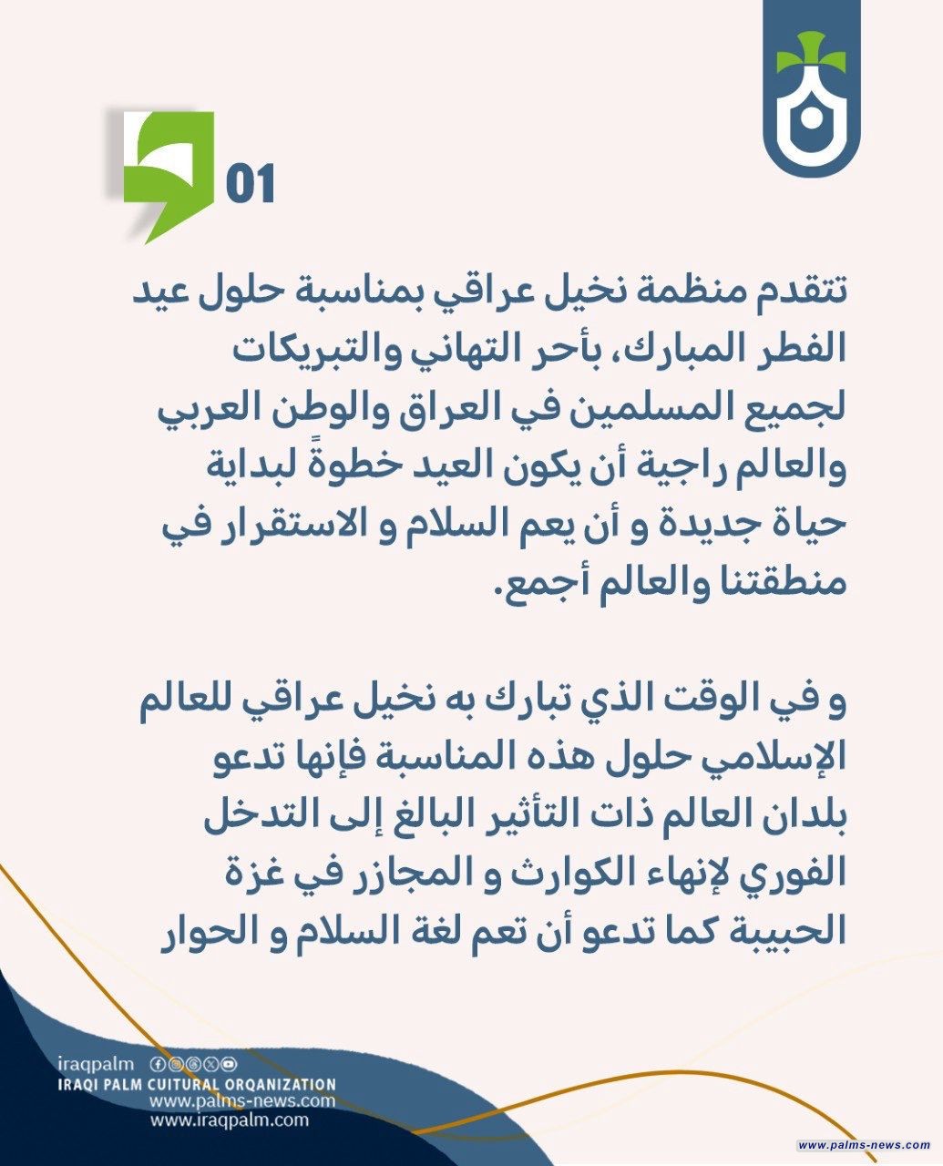 تتقدم منظمة نخيل عراقي بمناسبة حلول عيد الفطر المبارك، بأحر التهاني والتبريكات لجميع المسلمين في العراق والوطن العربي والعالم راجية أن يكون العيد خطوةً لبداية حياة جديدة و أن يعم السلام و الاستقرار في منطقتنا والعالم أجمع.