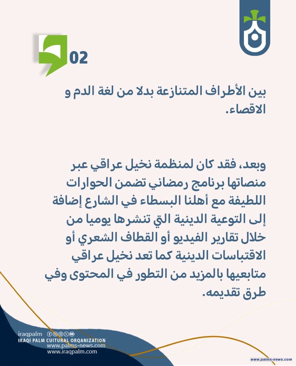 وبعد، فقد كان لمنظمة نخيل عراقي عبر منصاتها برنامج رمضاني تضمن الحوارات اللطيفة مع أهلنا البسطاء في الشارع إضافة إلى التوعية الدينية التي تنشرها يوميا من خلال تقارير الفيديو أو القطاف الشعري أو الاقتباسات الدينية كما تعد نخيل عراقي متابعيها بالمزيد من التطور في المحتوى وفي طرق تقديمه.