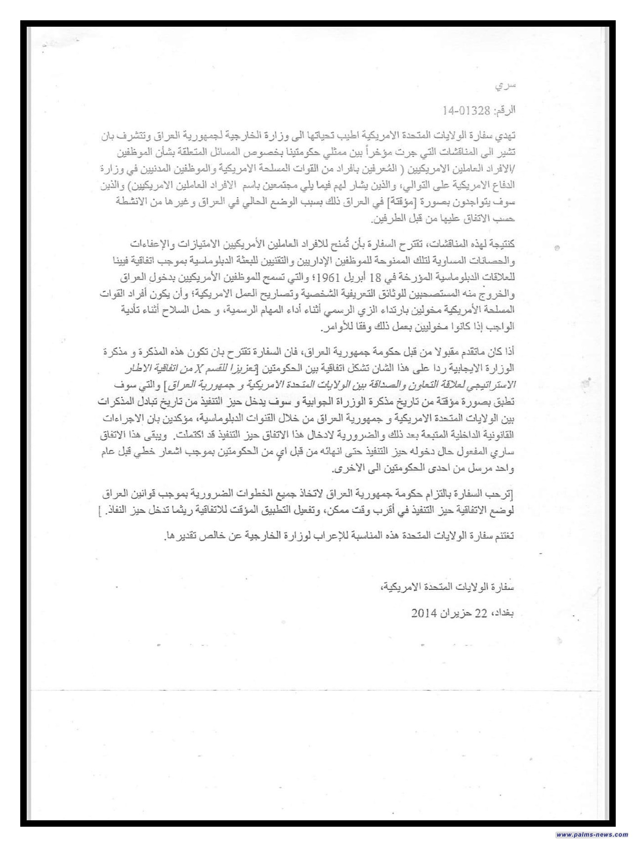 وقال الرديني"  لعلم الأخ الزبيدي ولكل مَن يتحرى الحقيقة، أنّ القوات الأميركية عادت إلى العراق بعهد الحكومة التي سبقت حكومة العبادي، وذلك ثابت برسالة طلب حملها وزير الخارجية آنذاك  هوشيار زيباري بتاريخ 2014/6/22، وأنّ العبادي تسنم رئاسة الوزراء بعد تصويت مجلس النواب بتاريخ 2014/9/10"