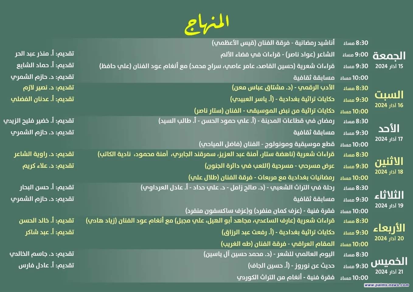 وسيحل رئيس منظمة نخيل عراقي الشاعر والإعلامي د. مجاهد أبو الهيل، ضيفاً على الأسبوع في جلسة شعرية تضم الشاعر عارف الساعدي والشاعر علي مجبل.