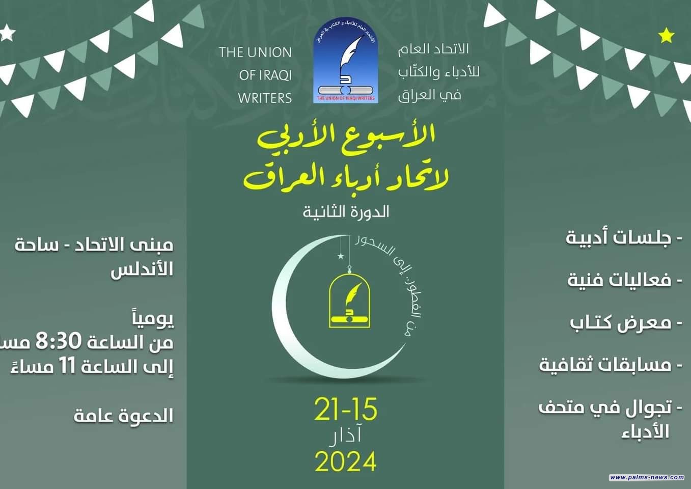 كما سيشهد أيضاً، معرضاً للكتاب يضمّ آخر المنشورات وموائد رمضانية، وحفلات توقيع وتجوال في متحف الأدباء.