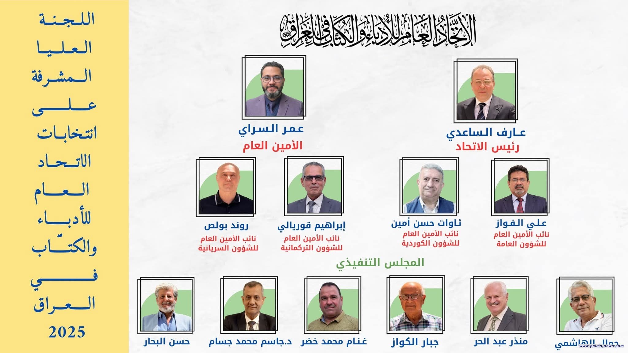 اجتمع المجلس المركزي للاتحاد العام للأدباء والكتّاب في العراق لانتخاب الرئيس والأمين العام والمكتب التنفيذي اليوم الجمعة ٢٠ حزيران ٢٠٢٥ إذ أعلن رسميا فوز الشاعر عارف الساعدي رئيساً، وعمر السراي أمينا عاما، وقد فاز الناقد علي حسن الفواز نائباً للأمين العام، وتوزعت المهام الأخرى كما يلي: