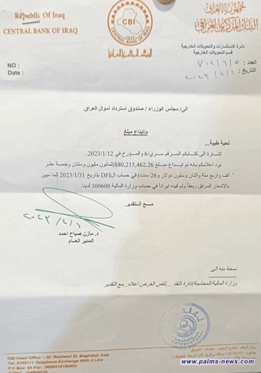 من جانب آخر، أعلن البنك المركزي العراقي، في اليوم ذاته، إيداع أكثر من 80 مليون دولار بصندوق استرداد أموال العراق.