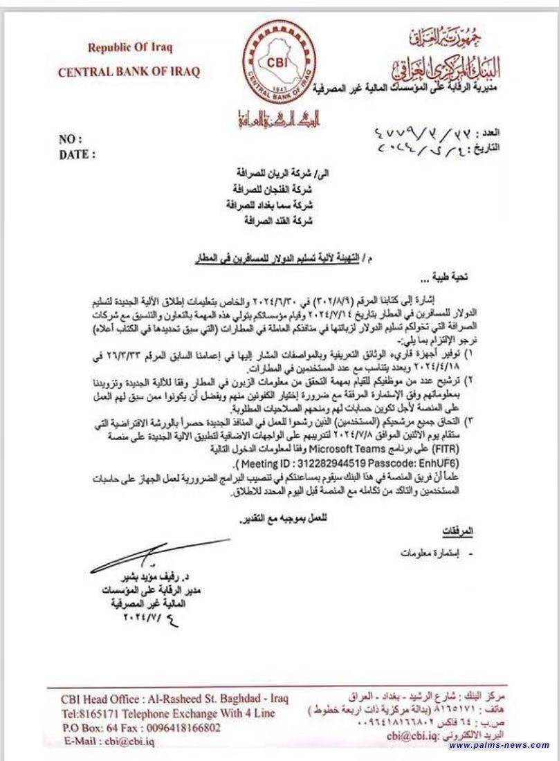 خاطب البنك المركزي، اليوم الخميس الرابع من تموز، شركات الصرافة المسؤولة عن بيع الدولار للمسافرين في المطارات، وهم كل من الريان والفنجان والقند وسما بغداد، من أجل إرسال موظفيهم إلى ورشة تقام يوم الاثنين، لتدريبهم وتهيئتهم من أجل العمل على آلية تسليم الدولار والبرامج الخاصة بآلية العمل