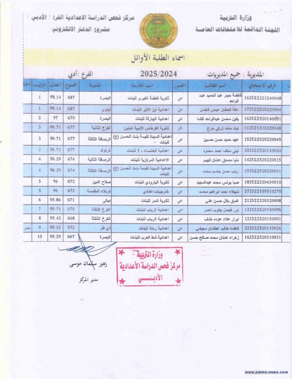 التربية تعلن أسماء الطلبة الأوائل للفرع الأدبي على مستوى العراق