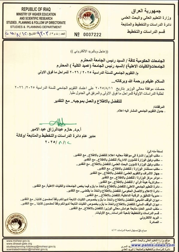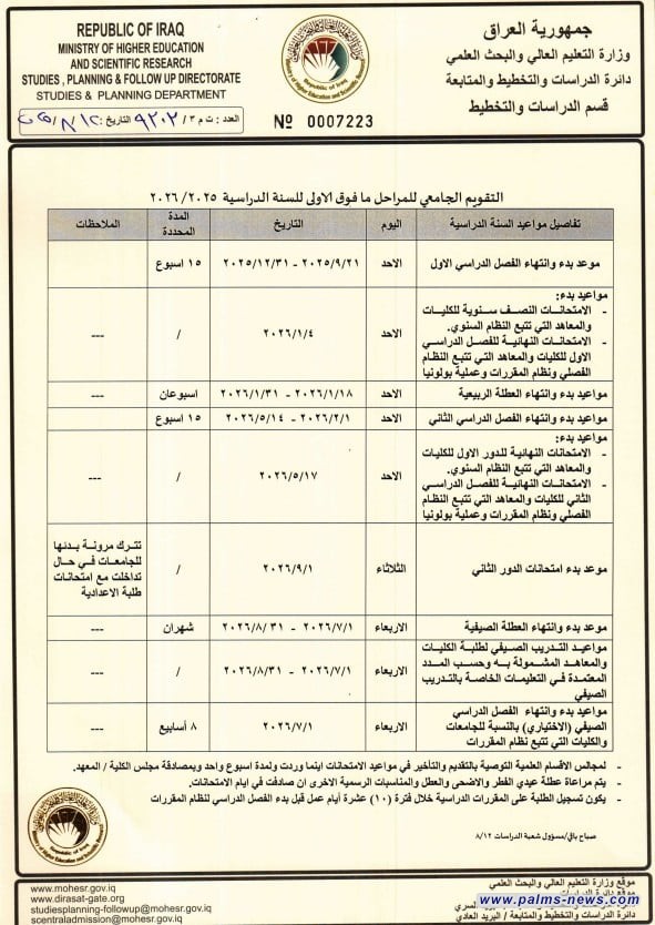 وقالت الوزارة في بيان لها، ان "وزير التعليم العالي والبحث العلمي نعيم العبودي وافق على التقويم الجامعي للسنة الدراسية 2026/2025 للدراسات الأولية في الجامعات الحكومية والأهلية للمراحل فوق الأولى".
