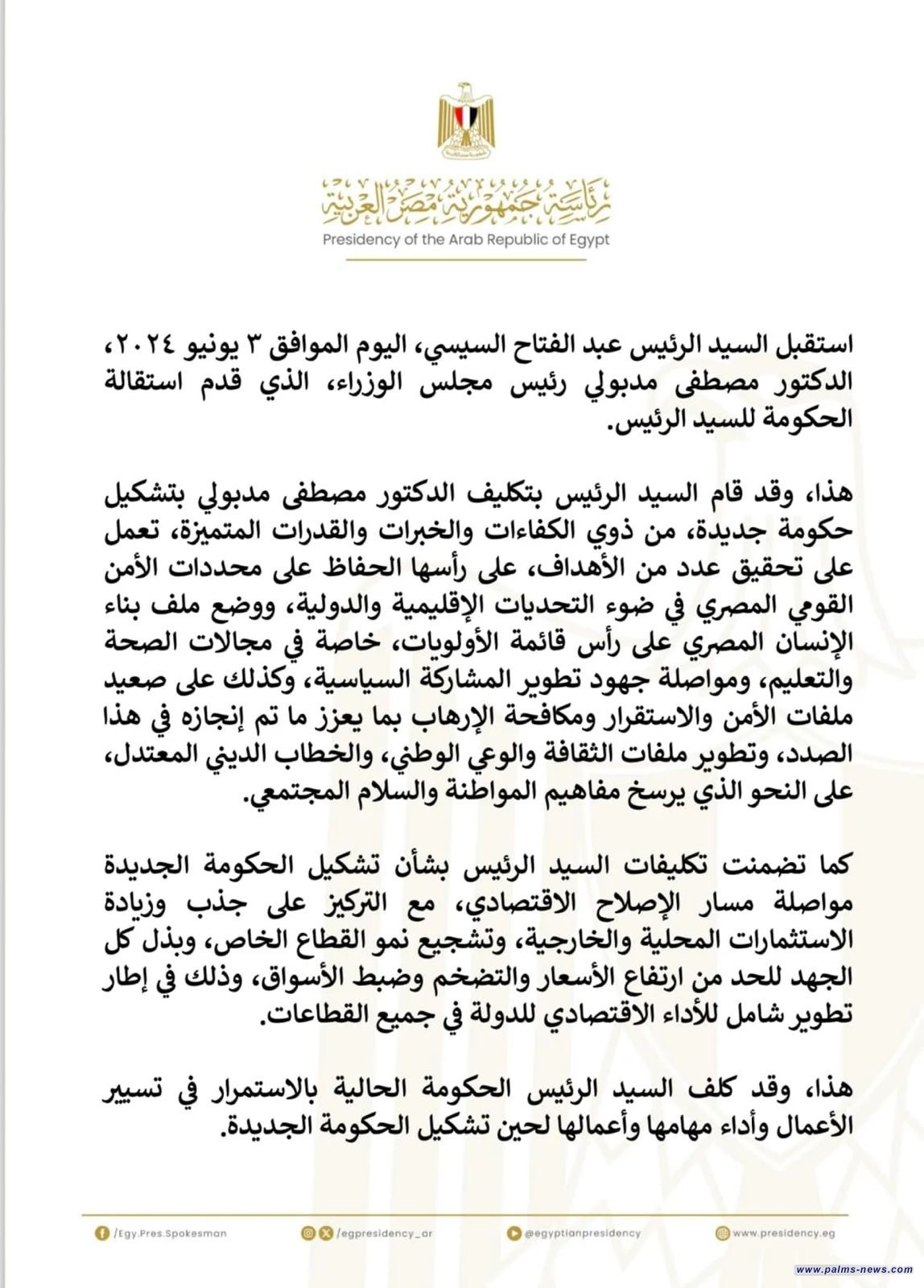 وقال بيان صادر عن رئاسة الجمهورية المصرية، إن السيسي كلف مدبولي بتشكيل الحكومة الجديدة من ذوي الكفاءات والخبرات المميزة.