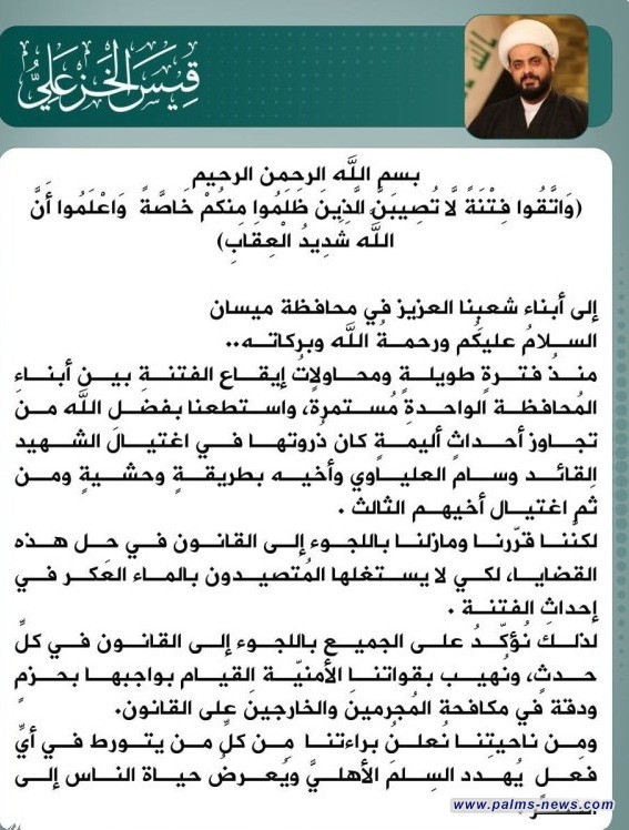 الخزعلي يحذر من الفتنة في ميسان ويدعو للاحتكام إلى القانون