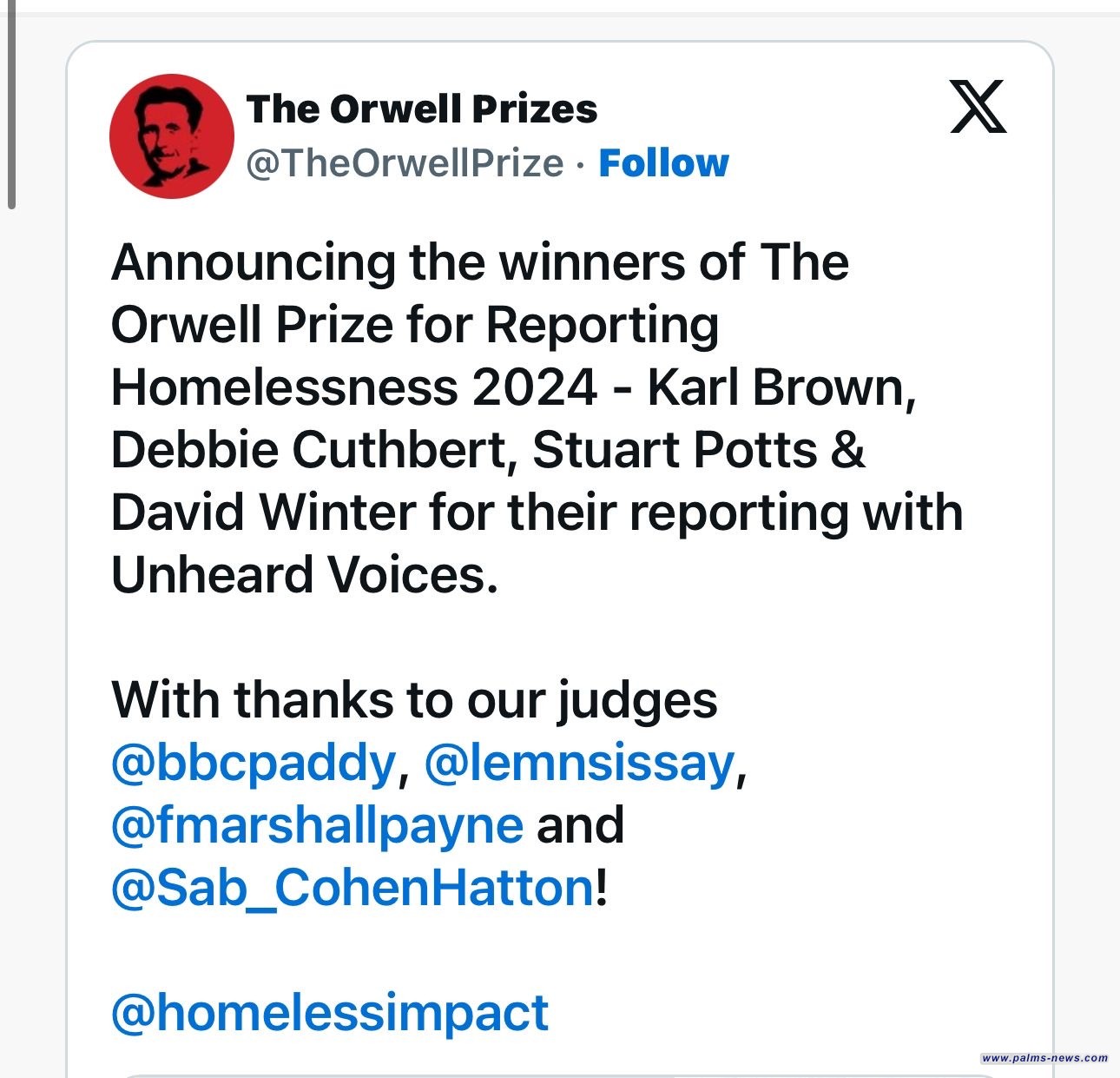 تمنح جائزة جورج أورويل للكتابة السياسية سنوياً من قبل مؤسسة أورويل الخيرية، بهدف تعزيز حرية التعبير والتفكير النقدي، وتأسست الجائزة في 1991 تكريماً للكاتب جورج أورويل الذي اشتهر بأعماله التي تنتقد الاستبداد ومنها "1984" و"مزرعة الحيوانات".